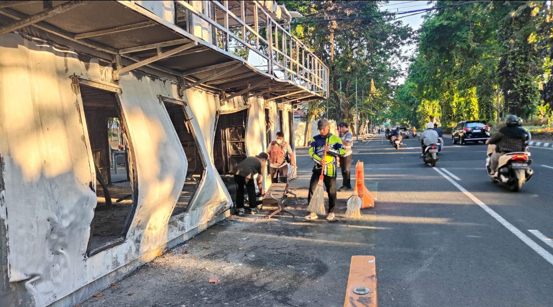 Surabaya – Warga bersama driver ojol membersihkan pos polisi yang dibakar massa aksi pada Jumat (29/8/2025) dini hari. Mereka menyapu, mengepel, hingga membersihkan serpihan kaca di lokasi. Terdapat 3 pos penjagaan yang dibersihkan pada Sabtu (30/8/2025) sekitar pukul 16.00 WIB. Yakni Pos Lantas Bundaran A. Yani atau Taman Pelangi, Raya Darmo atau Taman Bungkul, dan Wonokromo atau sisi timur KBS.