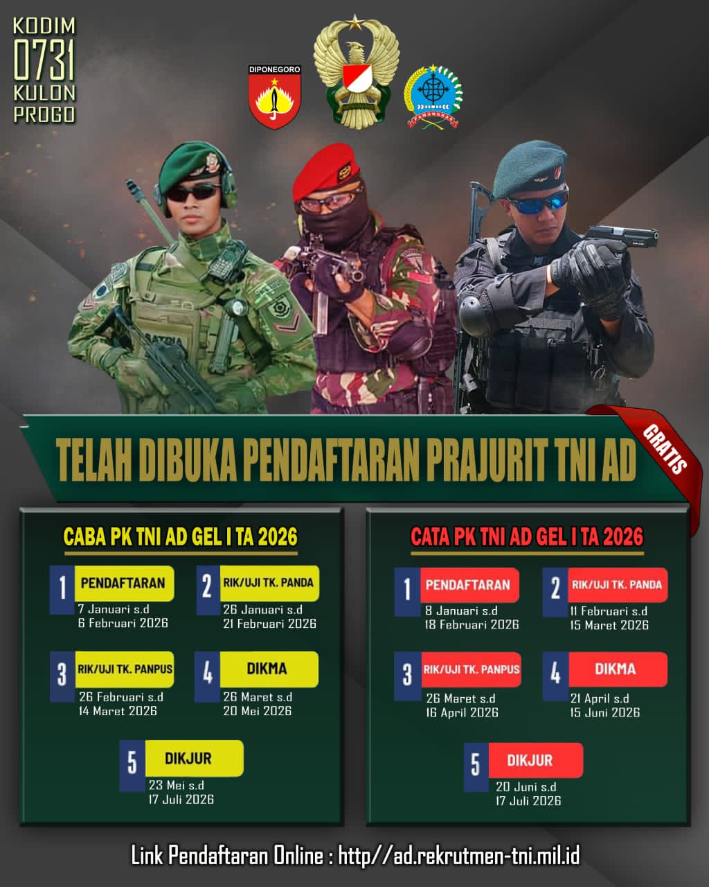 Beranda Berita Pendaftaran Prajurit TNI AD Pendaftaran Prajurit TNI ADAdmin - BeritaJanuari 15, 2026Januari 15, 2026 KomentarBagikan Kulon Progo, Yogyakarta – Telah dibuka Pendaftaran prajurit TNI AD CABA PK TNI AD GEL I TA 2026 dan CATA PK TNI AD GEL I TA 2026. langsung ke KODIM 0731/KULON PROGO Post Views: 67 KomentarBagikanBaca JugaUngkap Peredaran Sabu, Polres Pelabuhan Tanjung Perak Amankan 4,02 Gram dan Uang TunaiSalam Satu Pena : Media Online Kabar Jurnal Nusantara, Semoga Sukses Menjadi Inspiratif dan Warna BaruPelindo Cabang Golden Capa Gold Raih Green Proper 2024-2025, Memperkuat ke Pelabuhan Emas dan Berkelanjutan Diduga Tebang Pilih, Penertiban Satpol PP Kecamatan Krembangan Tuai SorotanKomitmen Nyata Lewat PTDH, Polres Tanjung Perak Perkuat Pengawasan InternalAntisipasi Curanmor, Polsek Semampir Bagikan Kunci Ganda Gratis untuk WargaPolda Jatim Razia THM Surabaya, 106 Pengunjung Dites Urine, Hasilnya Seluruhnya NegatifPolres Pelabuhan Tanjung Perak Bongkar Penipuan PO Sembako Murah, Pelaku DiamankanWujud Nyata Kemanunggalan TNI Dengan Rakyat, Babinsa Pakunden Bantu Renovasi RTLHPolres Lumajang Intensifkan Pengecekan LPG 3 Kg, Pastikan Distribusi Tepat SasaranSatresnarkoba Tanjung Perak Ringkus Pengedar Sabu, Sebut Barang Milik Ayah yang Kini DPO206 Tersangka dalam 149 Kasus, Berhasil Diungkap Polrestabes Surabaya dalam 4 Bulan SajaBerita TerkaitUngkap Peredaran Sabu, Polres Pelabuhan Tanjung Perak Amankan 4,02 Gram dan Uang TunaiSalam Satu Pena : Media Online Kabar Jurnal Nusantara, Semoga Sukses Menjadi Inspiratif dan Warna BaruPelindo Cabang Golden Capa Gold Raih Green Proper 2024-2025, Memperkuat ke Pelabuhan Emas dan Berkelanjutan Diduga Tebang Pilih, Penertiban Satpol PP Kecamatan Krembangan Tuai SorotanKomitmen Nyata Lewat PTDH, Polres Tanjung Perak Perkuat Pengawasan InternalAntisipasi Curanmor, Polsek Semampir Bagikan Kunci Ganda Gratis untuk WargaPolda Jatim Razia THM Surabaya, 106 Pengunjung Dites Urine, Hasilnya Seluruhnya NegatifPolres Pelabuhan Tanjung Perak Bongkar Penipuan PO Sembako Murah, Pelaku DiamankanWujud Nyata Kemanunggalan TNI Dengan Rakyat, Babinsa Pakunden Bantu Renovasi RTLHPolres Lumajang Intensifkan Pengecekan LPG 3 Kg, Pastikan Distribusi Tepat SasaranRekomendasi untuk kamuUngkap Peredaran Sabu, Polres Pelabuhan Tanjung Perak Amankan 4,02 Gram dan Uang TunaiSalam Satu Pena : Media Online Kabar Jurnal Nusantara, Semoga Sukses Menjadi Inspiratif dan Warna BaruPelindo Cabang Golden Capa Gold Raih Green Proper 2024-2025, Memperkuat ke Pelabuhan Emas dan Berkelanjutan Diduga Tebang Pilih, Penertiban Satpol PP Kecamatan Krembangan Tuai Sorotan