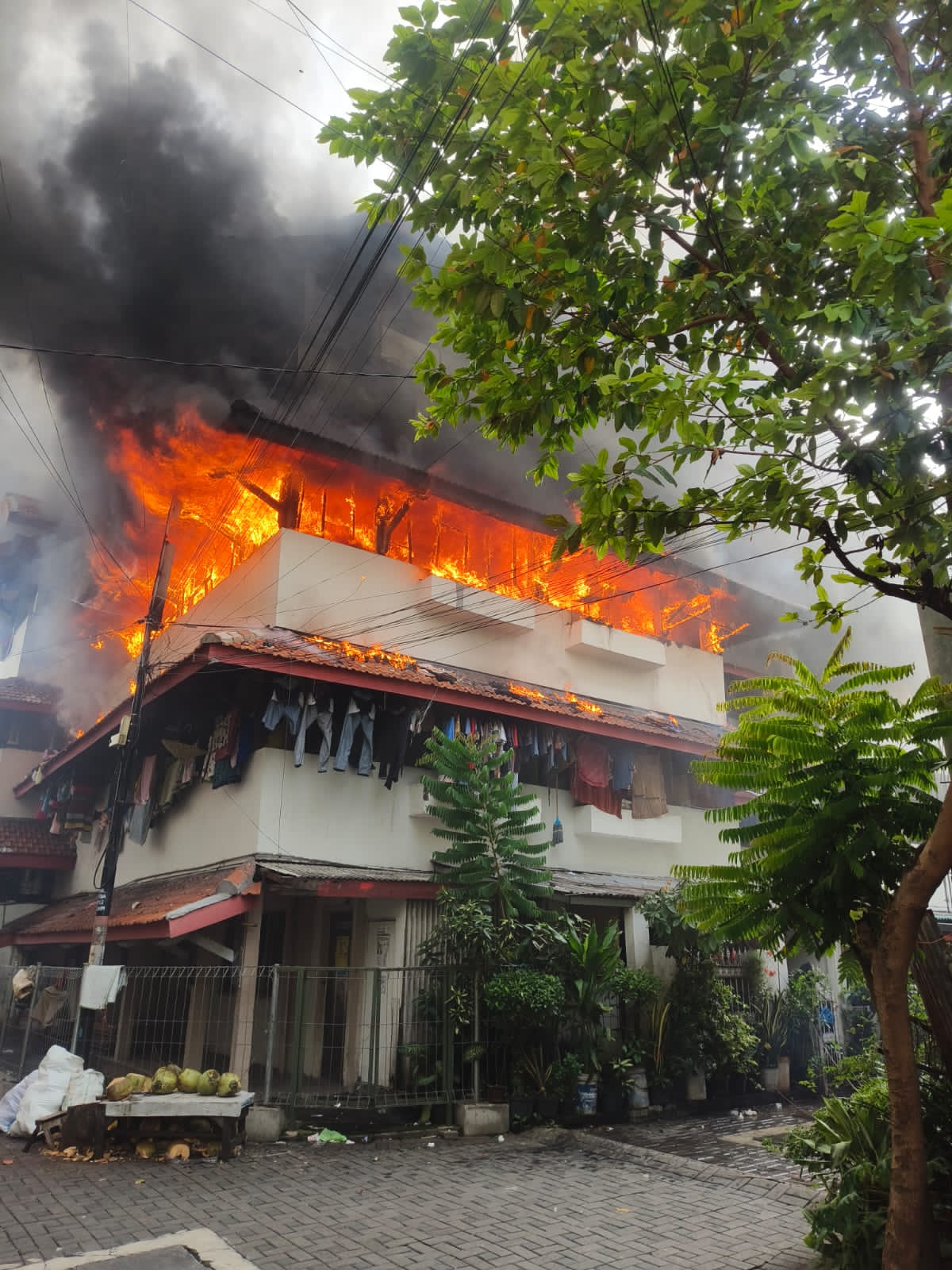 “Awalnya saya kira ada orang ribut biasa. Tapi pas buka pintu, asap sudah tebal dan api kelihatan dari dalam kamar di lantai tiga. Warga langsung panik turun semua,” ujarnya.