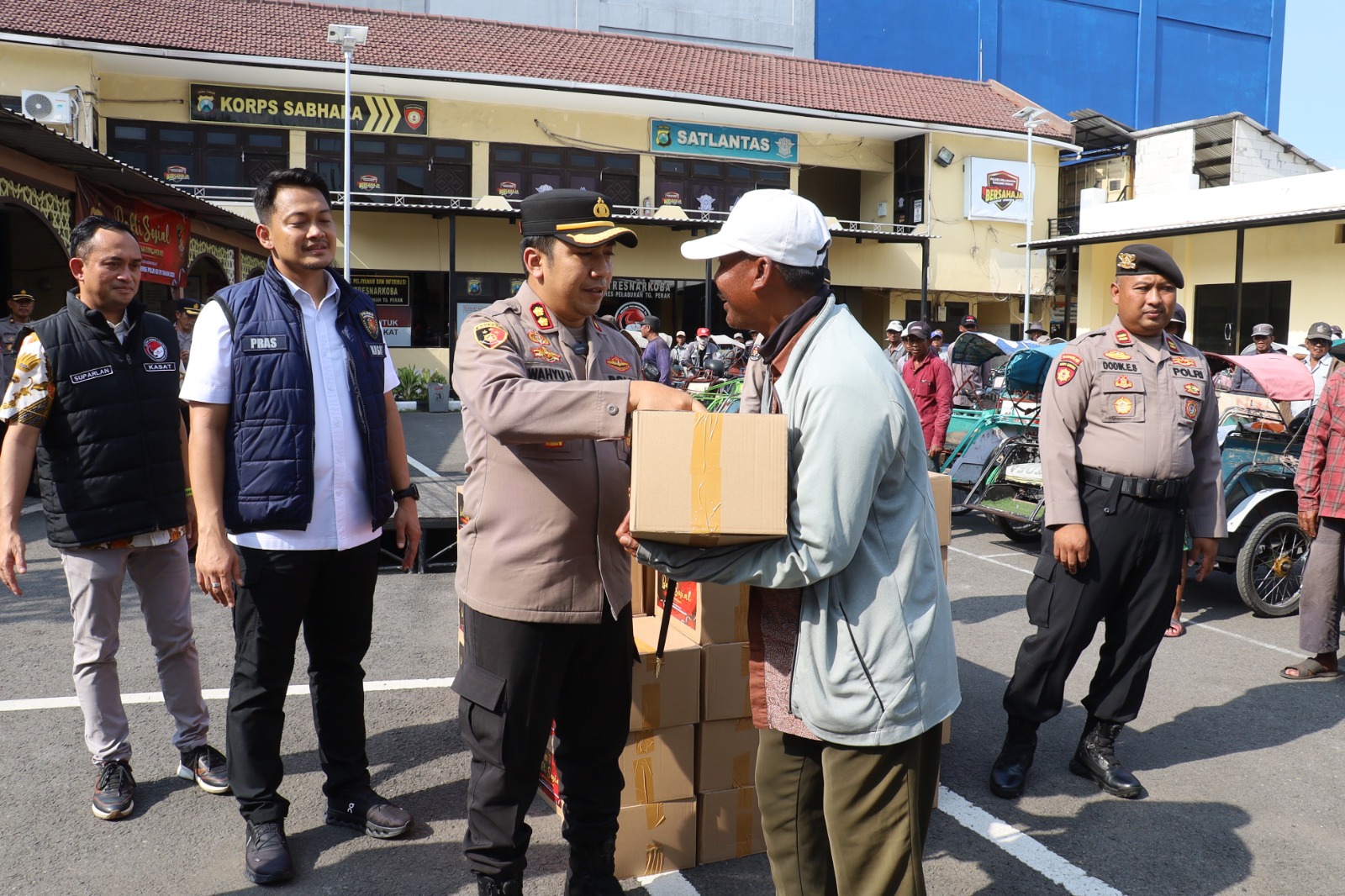 Di sela-sela pembagian sembako, Kapolres juga menyempatkan diri mensosialisasikan layanan Call Center 110 kepada para tukang becak dan warga sekitar.
